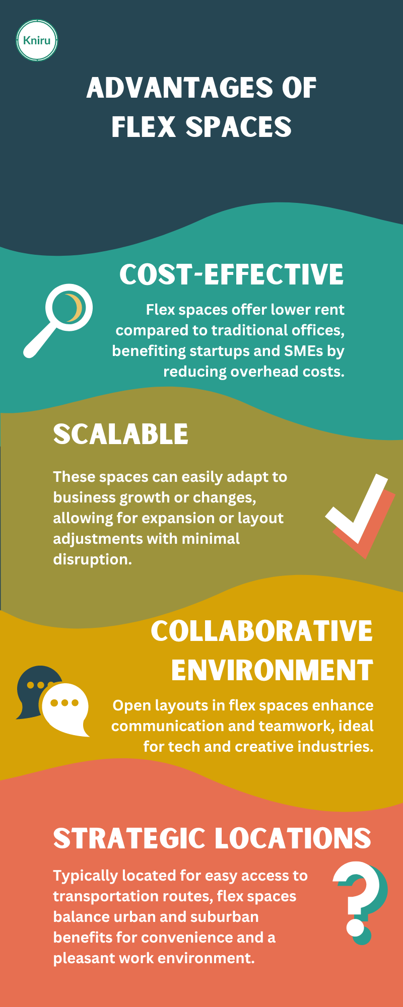 - Cost-Effectiveness: Flex spaces often offer lower rent compared to traditional office spaces or specialized industrial spaces, primarily due to their locations and multipurpose nature. This makes them particularly attractive to startups and SMEs (Small and Medium Enterprises) looking to minimize overhead costs.