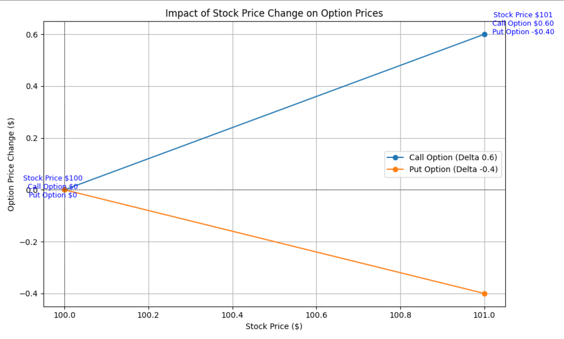 - Call Option with Delta 0.6: If the stock price increases to $101, the call option’s price is expected to increase by $0.60.